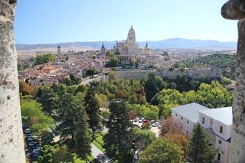 A climb up the Tower of John II (A.D.1405-1454) enabled me to enjoy a scene of Segovian stone buildings, walls, an unused 26 metres deep moat and scenic parkland.