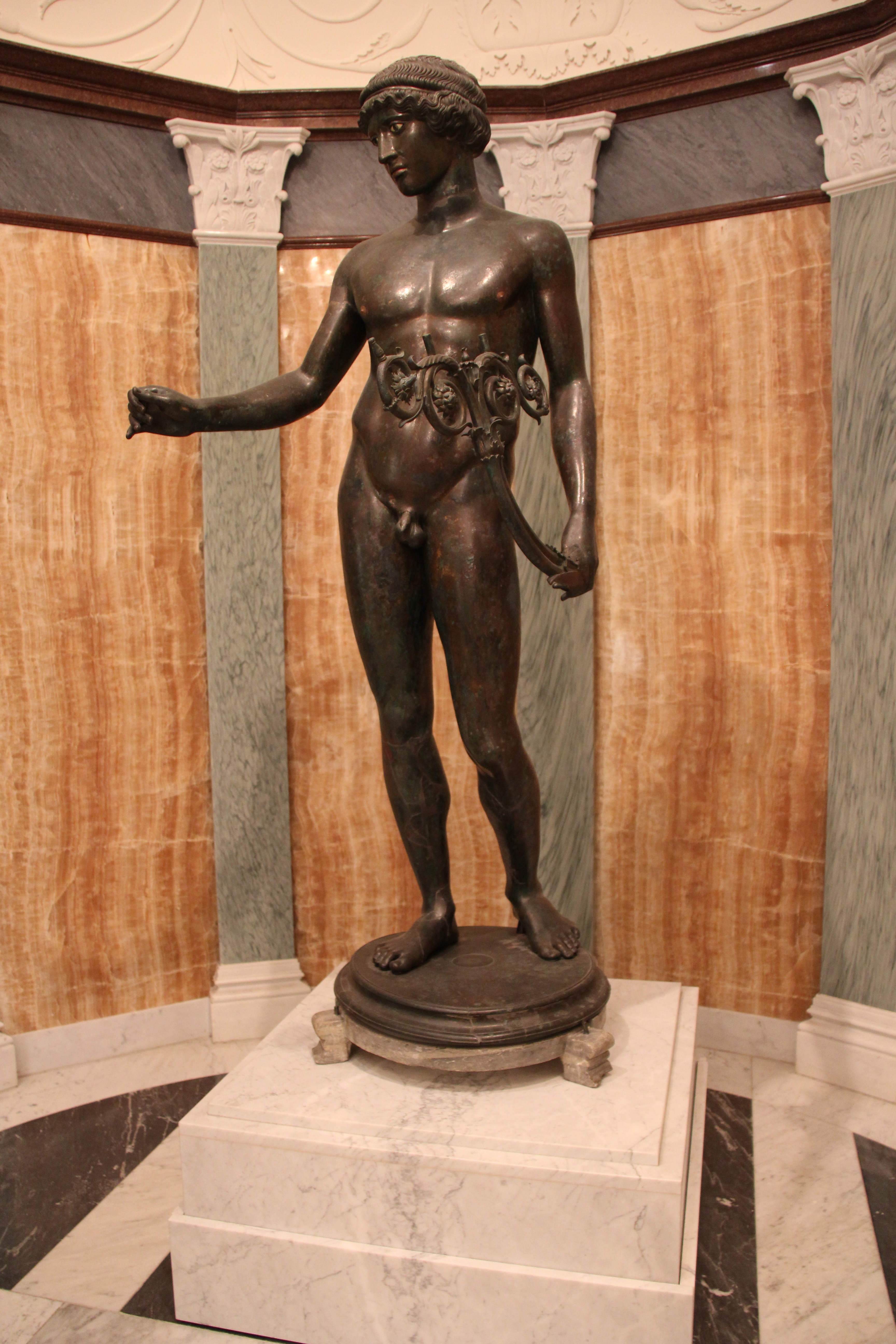 A 'Basilica' or large public greeting hall is included in the Villa's design. Decorative motifs include acanthus scrolls on the barrel vault's ceiling frieze borrowed from the ceiling of Pompeii's Forum Baths, the half-dome decoration from the 'House of Menander' in Pompeii, the ceiling's coffered panels from the 'House of the Cryptoporticus' in Pompeii, marble capitals copied from Herculaneum's 'House of the Deer' and an elaborate multi-marble floor from the 'Villa dei Papiri' itself. The pièce de résistance of the Basilica is 'Youth as a Lamp Bearer'. The bronze statue was excavated in 1925 from the 'House of the Ephebe' in Pompeii believed to have possibly belonged to Publius Cornelius Tegete.