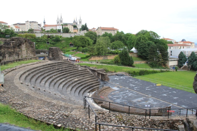Cut into the side of Fourviere hill the large theatre was being prepared for an annual Lyonnaise musical event. I don’t know the expected audience capacity now but an estimated 10,000 people attended the theatre in Augustan times (circa late 1st century B.C.). Its neighbouring, smaller ‘Odeon’ theatre is dated later, circa 1st century A.D. Many Gallo-Roman shops and residential buildings were removed to build the Odeon theatre which was mostly used for speeches and poetry recitals. Some shop foundation walls still remain at the back of the theatre revealing an incredible drainage design. Gallo-Roman audiences at Lugdunum (Lyon) had a commanding view across the confluence of the Rhone and Saone Rivers. On a clear day a spectator could see as far as the French/Swiss Alps, today’s Mont Blanc. Unfortunately not much remains of the beautiful marble that dressed this centre of ‘otium’ (leisure). Medieval Lyonnaise were great believers not only in God but also in recycling !!