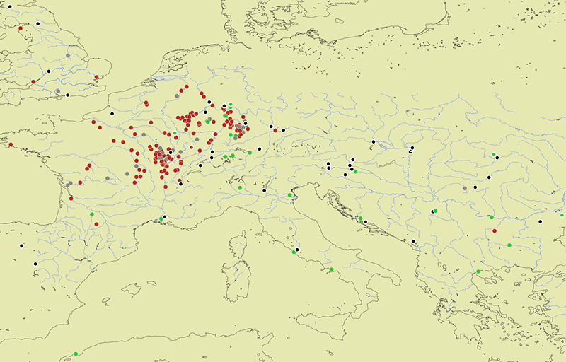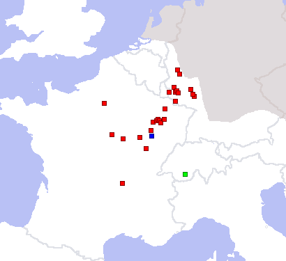 Distribution of epigraphic inscriptions dedicated to Rosmerta (in red), and also to Cantismerta (green: one in Switzerland) and Atesmerta (blue: one in Champagne). Wikipedia commons QuartierLatin1968 (Owen Cook). According to this distribution map, Rosmerta was popular in north-eastern Gaul.