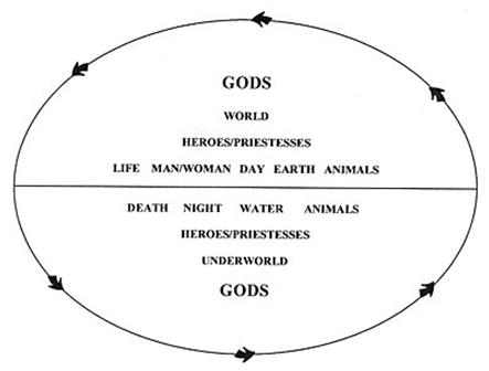 A constant cyclical movement animated their universe. Gods, animals and some humans - the heroes and the priestesses - penetrated both sides of this world and the Underworld. The supreme god was, at the same time, the lord of both worlds. Animals, especially those most frequently worshipped, such as the wild boar, the stag, the serpent, the bull, the cat, the dog and some birds - the duck and the swan - could come and go between this world and the Underworld. This was certainly true of the heroes and priestesses who could easily step into and from both worlds (Gamito 2005). See: www4.uwm.edu/celtic/ekeltoi/volumes/vol6/6_11/gamito_6_11.html