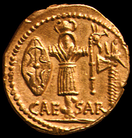 Caesar, gold aureus, 48 B.C. showing a Gallic trophy captured in Gallic Wars